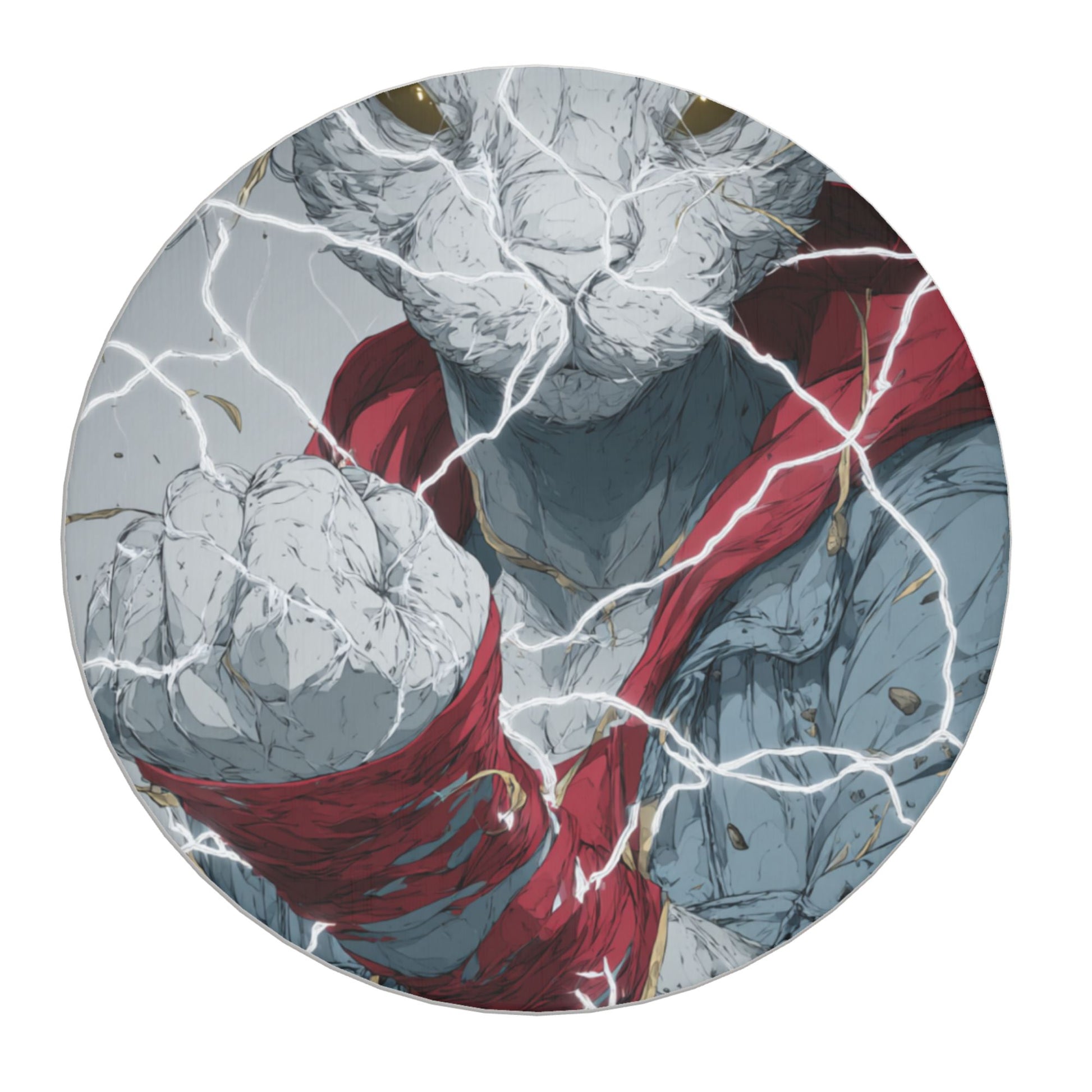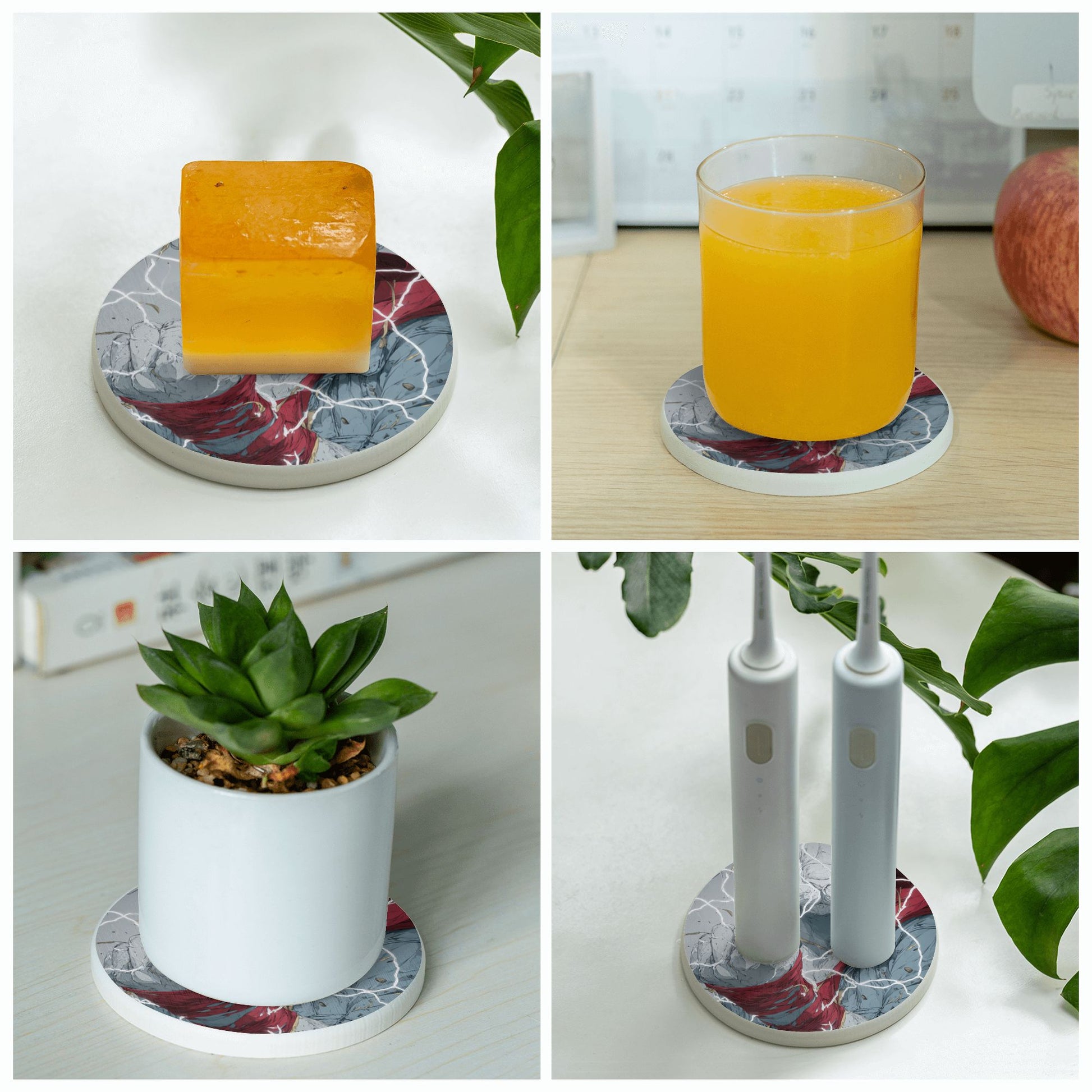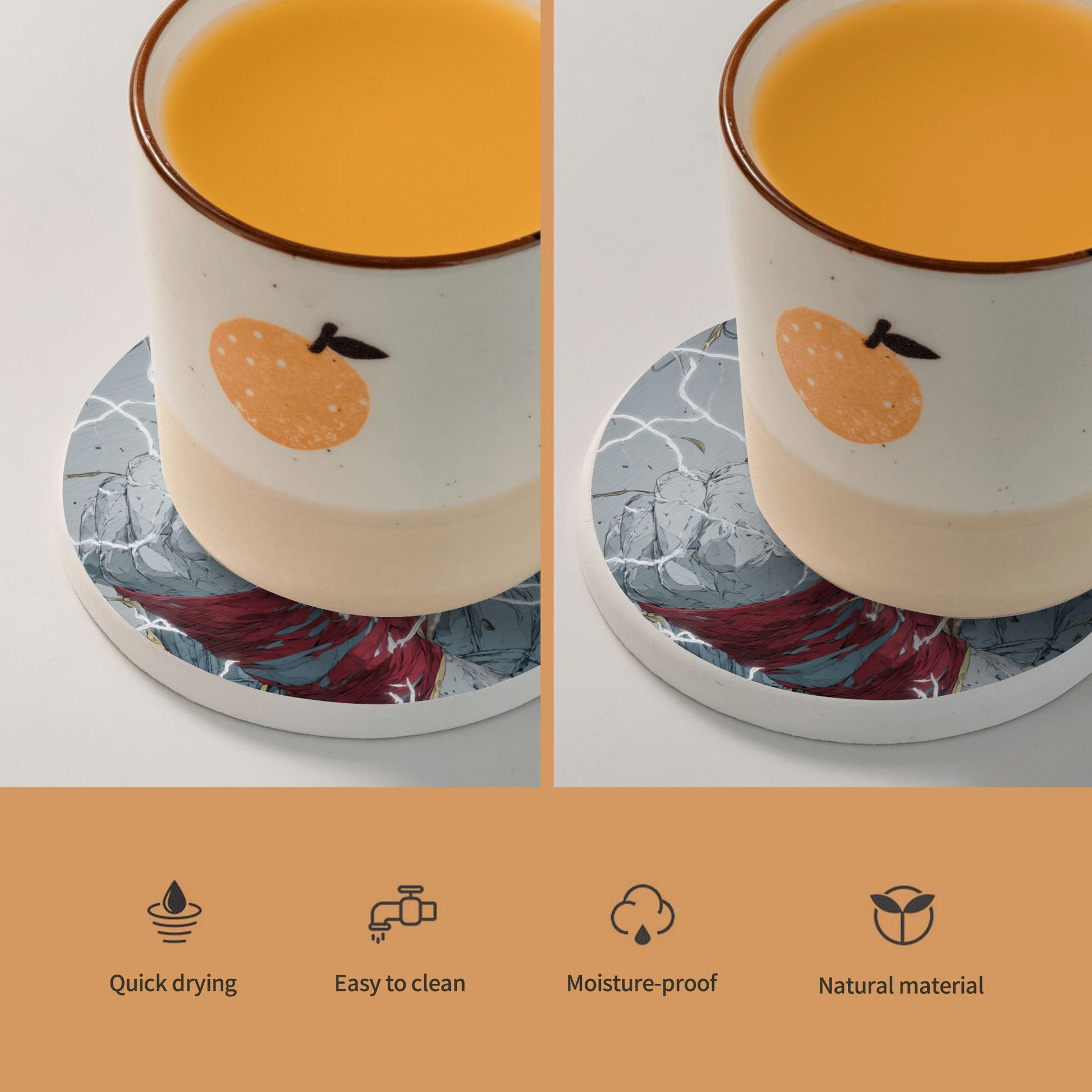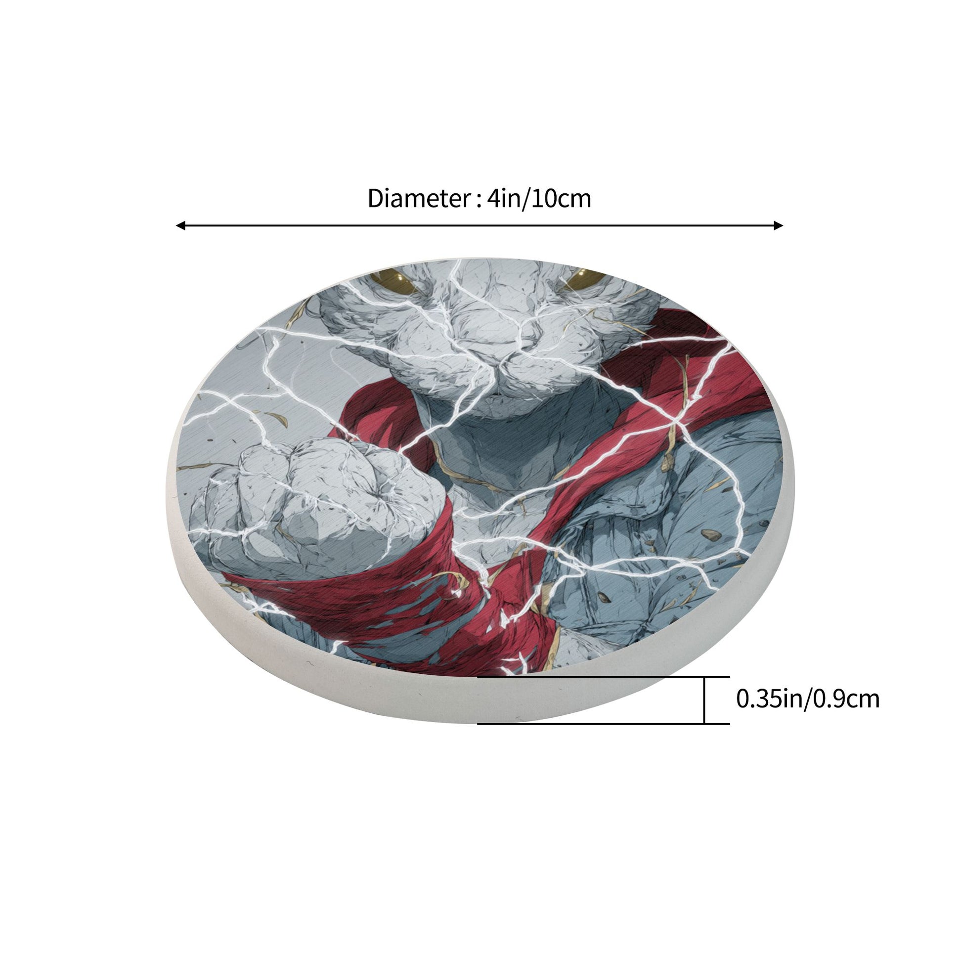 This uniquely designed coaster is made from natural diatomite, offering excellent absorbency and rapid drying to keep your tabletop clean and dry. Its surface showcases a powerful illustration of a stone-like cat warrior, charging forward with lightning-infused fists. The bold colors and intense energy make this a standout piece for fans of fantasy, comics, and epic character art.