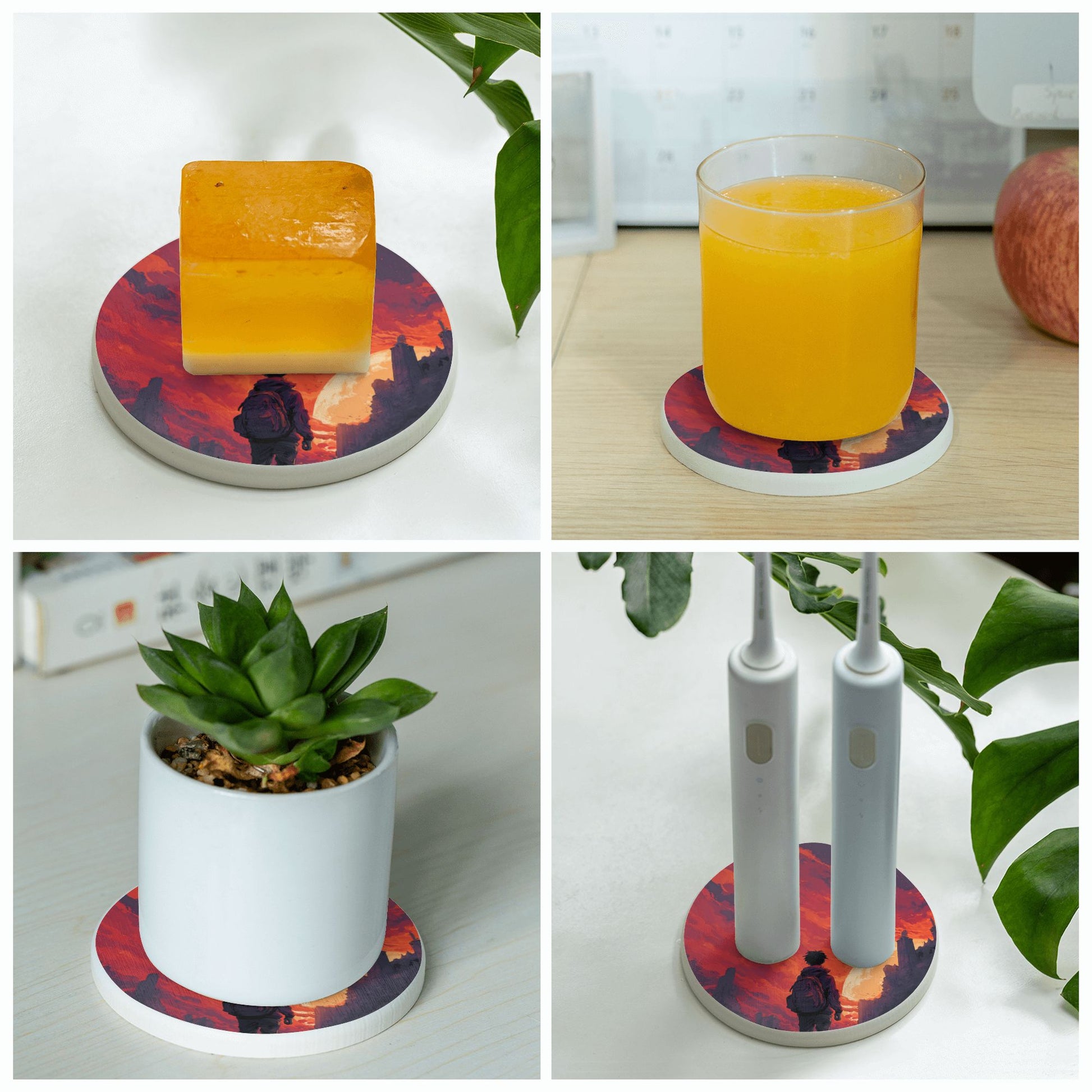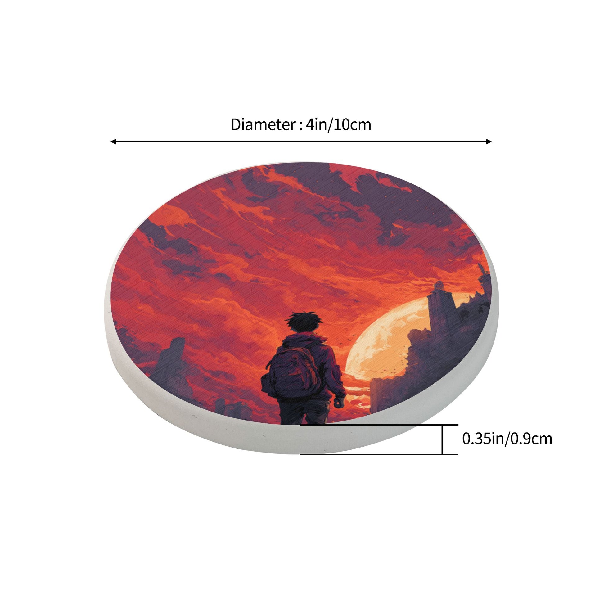 Made from eco-friendly natural diatomite, this round coaster excels in water absorption and fast drying—perfect for keeping your tabletop dry and stain-free. The surface features a breathtaking illustration: a lone traveler with a backpack standing before a vivid sunset sky, gazing at a massive glowing sun setting behind ruined silhouettes. The rich orange and crimson tones evoke a sense of adventure, solitude, and wonder.
