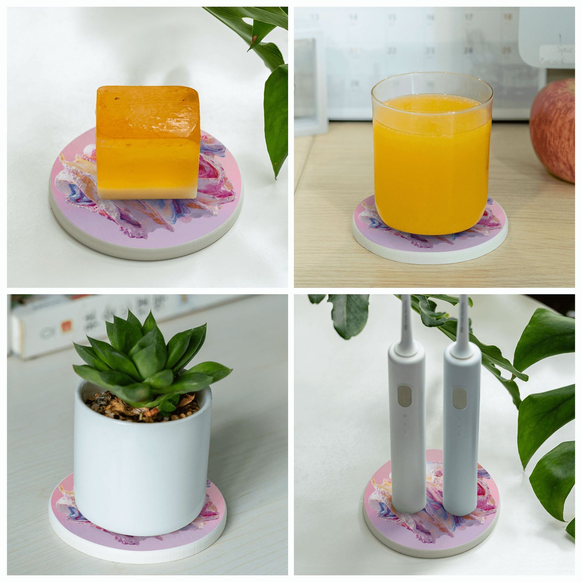 Crafted from eco-friendly natural diatomite, this round coaster offers powerful water absorption and rapid drying. It instantly absorbs moisture from your glass or mug, keeping your tabletop dry and tidy. The surface features a dreamy whipped-cream-like art design in pink, purple, blue, and gold hues. This eye-catching design looks like a floating cream sculpture and brings a stylish artistic vibe to any setting.